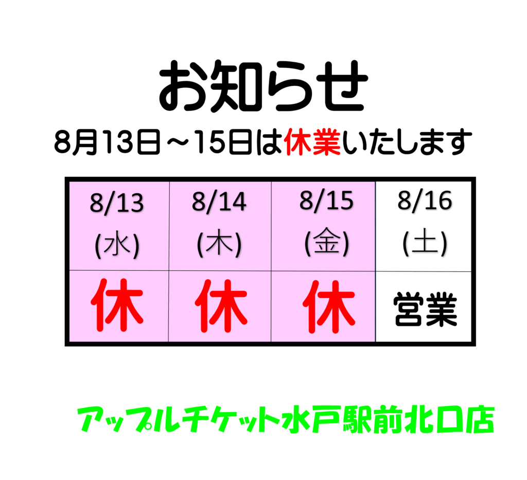 こんにちは。水戸駅北口徒歩1分「アップルチケット水戸駅前北口店」です。