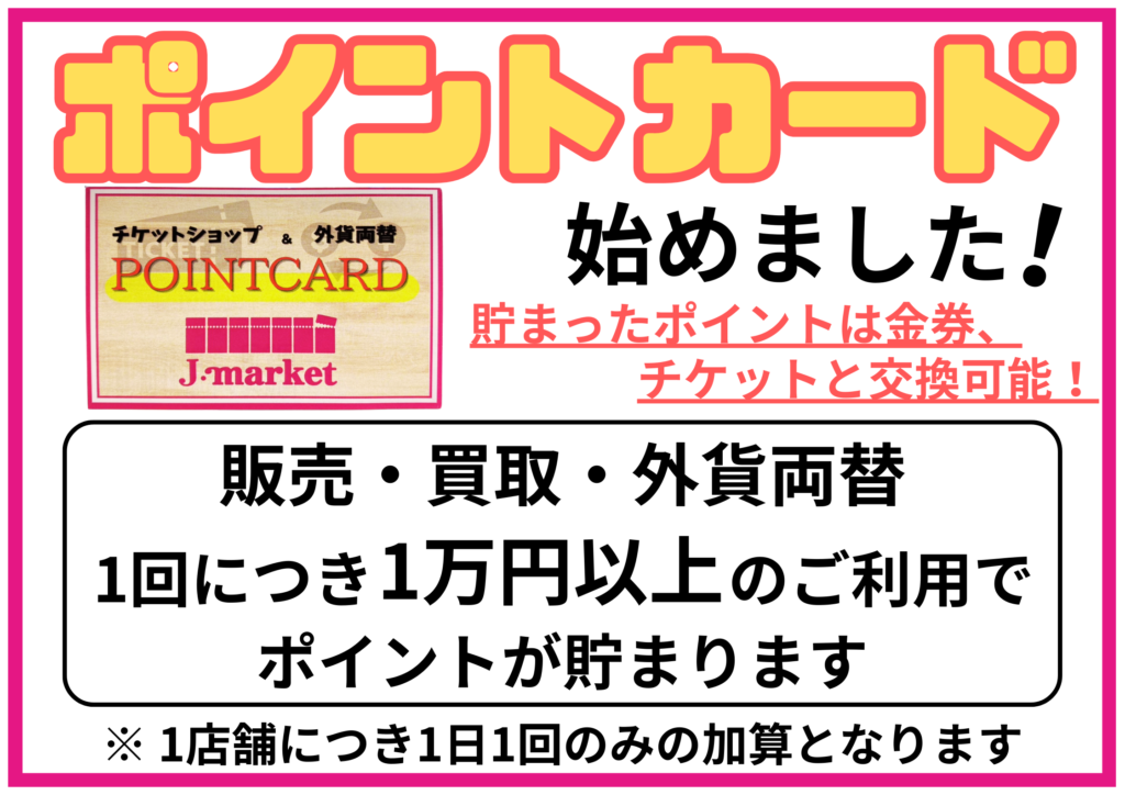 アップルチケット全店、Jマーケット全店共通でポイントを貯める事ができます。ポイント付与は1店舗日1回となりますが、1日で複数店舗をご利用頂いてポイントを貯めることはできます。